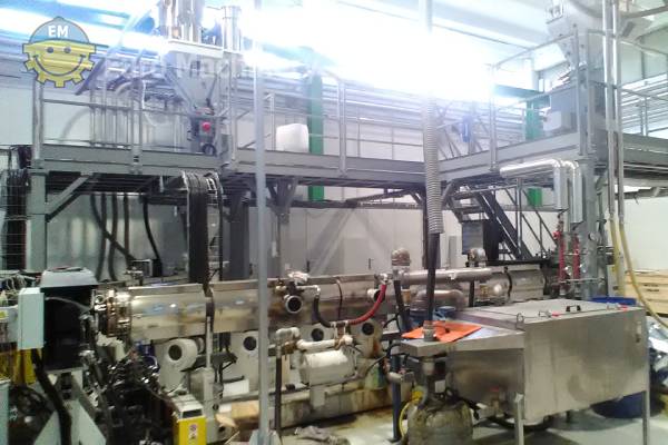 Linea di estrusione lastre AMUT per la lavorazione di PP e ABS. Coestrusore di lastre a 2 strati, in grado di produrre 550 Kg/h, spessore del materiale da 0,3 mm a 2 mm. Marca e modello: AMUT Larghezza del foglio: 820 mm o 410 mm Materiali da lavorare: PP, ABS Spessore del materiale: Min 0,3 mm – max 2 mm Produzione: 550 kg/h Estrusori:- Estrusore principale (strato B) tipo EA100/52D Potenza: 36,2 kW