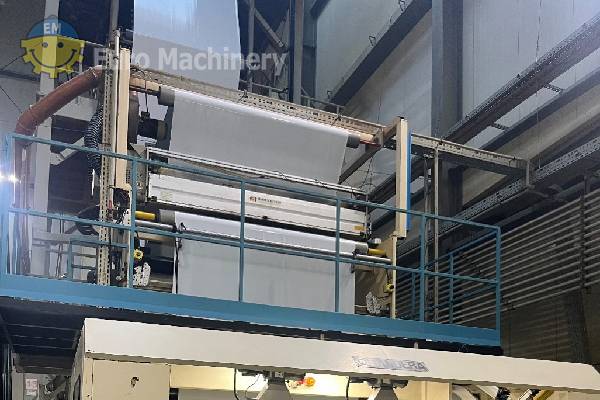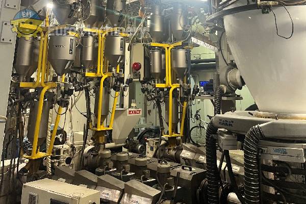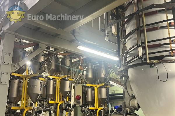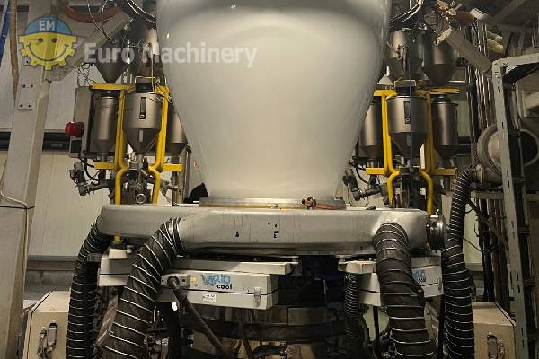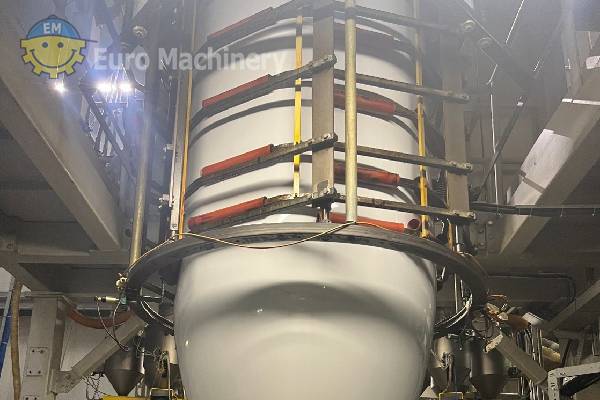 Linea di coestrusione di film soffiato a 3 strati Bandera per l’industria del packaging e del converting. Coestrusore per film soffiato con filiera diametro 400, IBC, controllo dello spessore. Marca e modello: BANDERA Estrusori: Film soffiato a 3 strati Testa di estrusione Testa d’estrusione:- Diametro dello stampo 400 mm