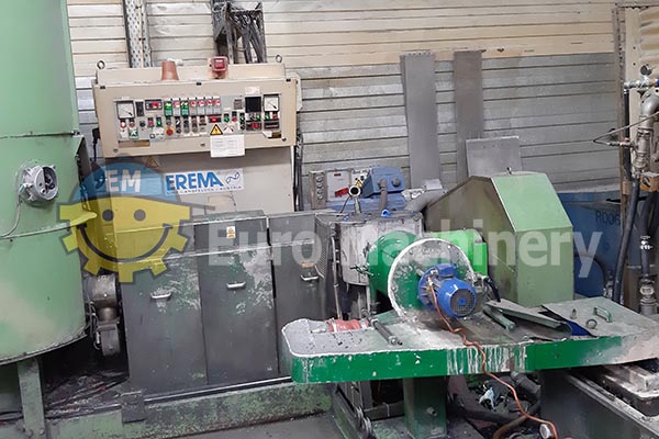 Macchina di riciclo Erema RGA in ottime condizioni di funzionamento. Per riciclaggio di rifiuti di plastica. Marca e modello: EREMA RGA 100-SW Materiali: PE, PP, LDPE, HDPE Diametro vite: 100 mm Rapporto L/D: 15 L/D Produzione: Fino a 400 kg/h, a seconda del tipo di materiale e della velocità di alimentazione Cambia filtro prima del taglio in testa: Controflusso a doppio pistone Sistema d’alimentazione del materiale: Nastro trasportatore con metal detector Tipo di tramoggia per estrusore: Trituratore-Combinazione d’estrusori Sistema di rigranulazione: Taglio in testa in acqua – Sistema a ricircolo acqua Strumenti ed accessori:- Bagno d’acqua