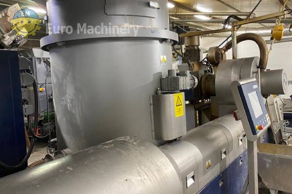 Macchina per la produzione di pellet di plastica INTAREMA 1108 TVEplus con doppio degasaggio e filtro continuo laser. Linea di riciclaggio Intarema per il trattamento di PE, PP e vite di diametro 80 mm, con produzione fino a 450 Kg/h. Marca e modello: EREMA Intarema 1108 TVEplus LF Materiali: PE, PP Diametro della vite: 80 mm Produzione: Fino a 450 kg/h, a seconda del tipo di materiale e della velocità di alimentazione. Degasaggio: Doppio degasaggio Cambio schermo prima della degassificazione: Filtro continuo perforato a fogli laser Sistema di alimentazione del materiale: Nastro trasportatore con metal detector Tipo di tramoggia per estrusore: Sistema densificatore-estrusore Sistema di pellettizzazione: Taglio in testa – Sistema a circolo d’acqua Potenza:- Tensione: 3×400 VAC + PE