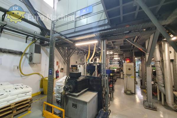 Linea di estrusione monostrato Reifenhäuser Kirion in grado di lavorare il PE. Estrusore monostrato dotato di una vite di 100 mm di diametro e di un’apertura di 1600 mm di larghezza. Tipo: REIFENHÄUSER KIRION Materiali da trattare: PE Tipo: Estrusore mono-strato Diametro della vite: 100 mm Traino:- Larghezza 1600 mm