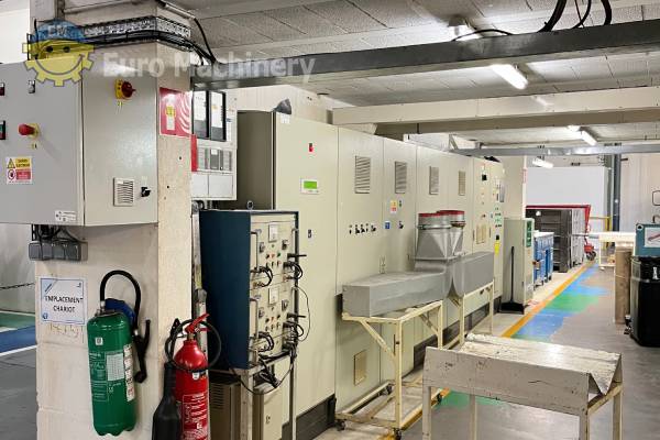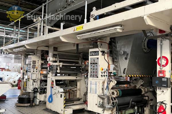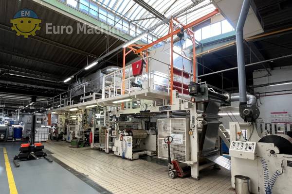 Linea di laminazione e rivestimento Schiavi per l’industria dell’imballaggio flessibile. Questa laminatrice è una macchina a solvente e offre una produzione con larghezza del nastro di 1060, velocità massima di 180 m/min. Marca e modello: Schiavi Tipo: Base solvente Tipo di produzione: Linea di laminazione e rivestimento Numero di unità di asciugatura prolungata: 4 Larghezza nastro: 1060 mm Larghezza massima del cilindro: 1150 Dev max 750 mm Velocità massima (metri/min): 180 m/min Diametro bobina in ingresso. 1000 mm Diametro bobina in uscita. 1000 mm Altre informazioni:- Stampa inversa: Nessun inchiostro ma possibilità di rivestimento