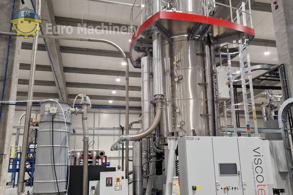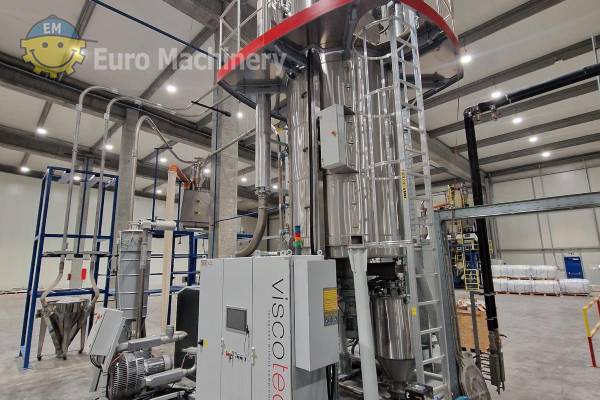 Decontaminazione ed essiccazione delle scaglie di PET di VISCOTEC per il riciclaggio del PET. Apparecchiature di riciclaggio in grado di trattare le scaglie di bottiglie PET PCR. Marca e modello: VISCOTEC DYNAVAC deCON50 Materiale che può essere lavorato: Scaglie di bottiglie PET PCR Aree di applicazione: Riciclaggio del PET Metodo di funzionamento: I fiocchi di PET vengono preriscaldati e introdotti sotto vuoto nei contenitori del reattore. Con il sistema DYNAVAC, le temperature di ebollizione dell’acqua e dei contaminanti presenti in vengono notevolmente abbassate, il che porta a un’eccellente asciugatura e decontaminazione a temperature e tempi inferiori a quelli normalmente richiesti. L’uscita appositamente progettata del deCON50 porta a un vero e proprio First In First Out di ogni singola scaglia, garantendo un trattamento continuo prima che le scaglie lascino il reattore attraverso una saracinesca sottovuoto per passare alla fase successiva del processo. Vantaggi:- Decontaminazione dei flaconi PCR secondo EFSA e FDA